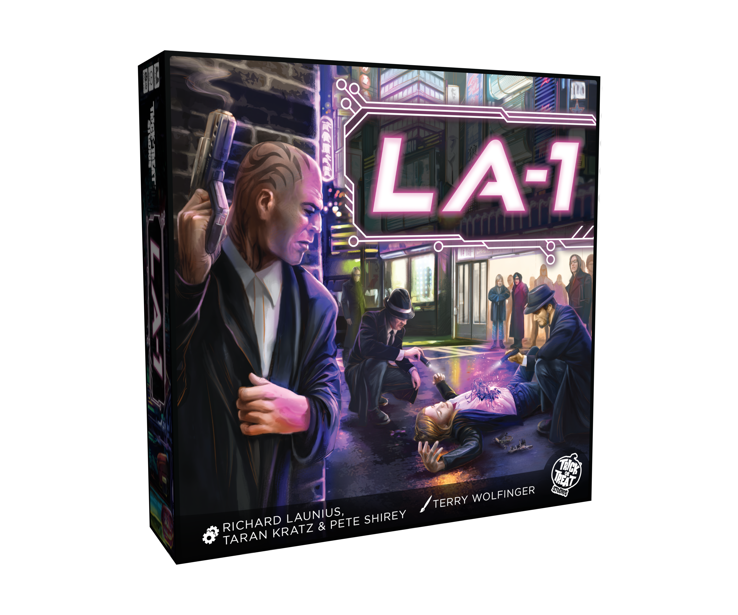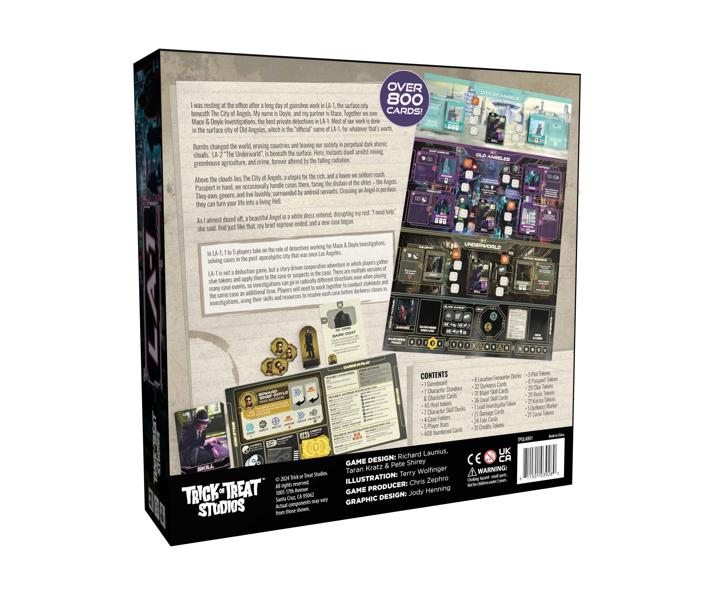 In LA-1, 1 to 5 players take on the role of detectives working for Mace & Doyle Investigations, solving cases in the post-apocalyptic city that was once Los Angeles. LA-1 is not a deduction game, but a story driven cooperative adventure in which players gather clue tokens and apply them to the case or suspects in the case. There are multiple versions of many case events, so investigations can go in radically different directions even when playing the same case an additional time. Players will need to work together to conduct stakeouts and investigations, using their skills and resources to resolve each case before darkness closes in.