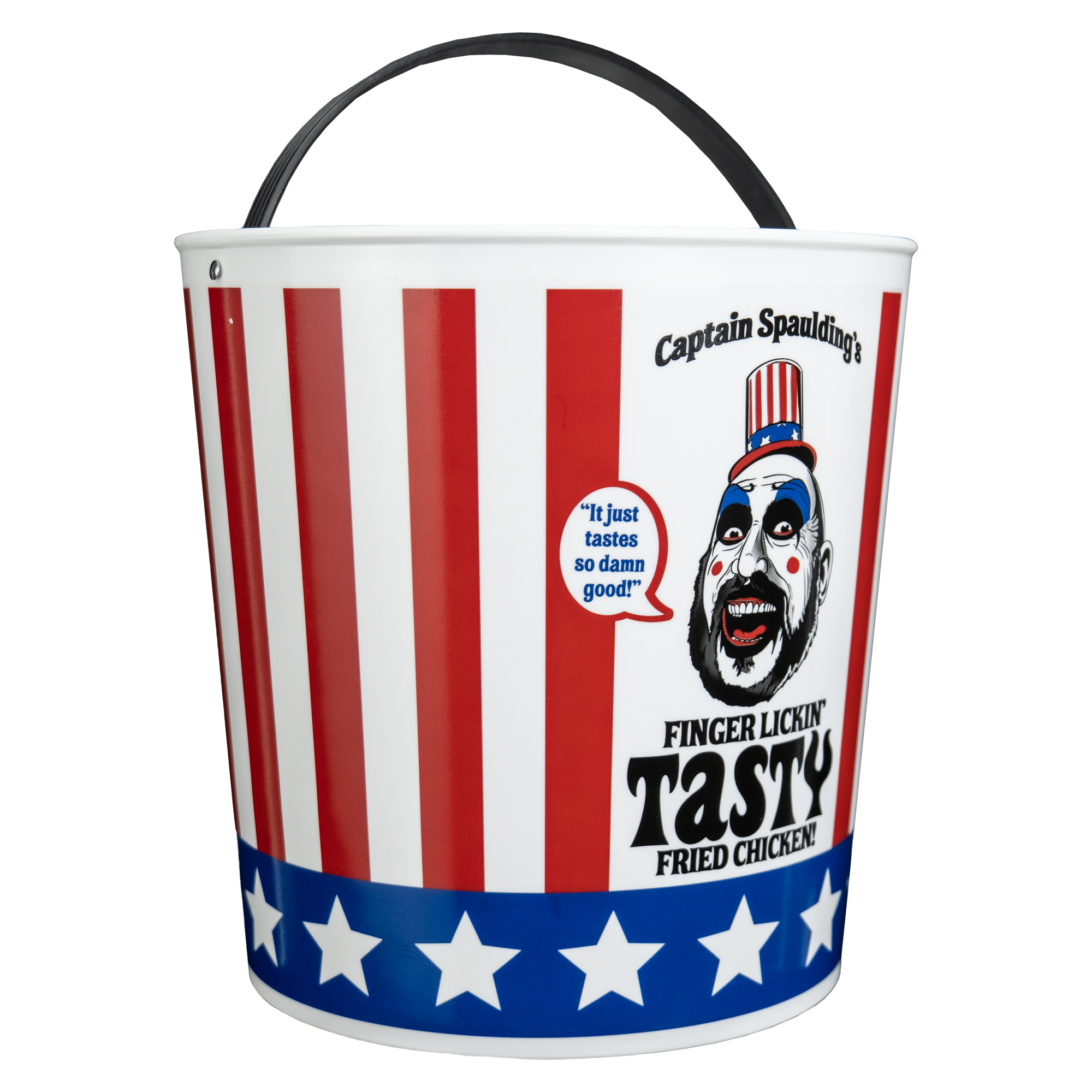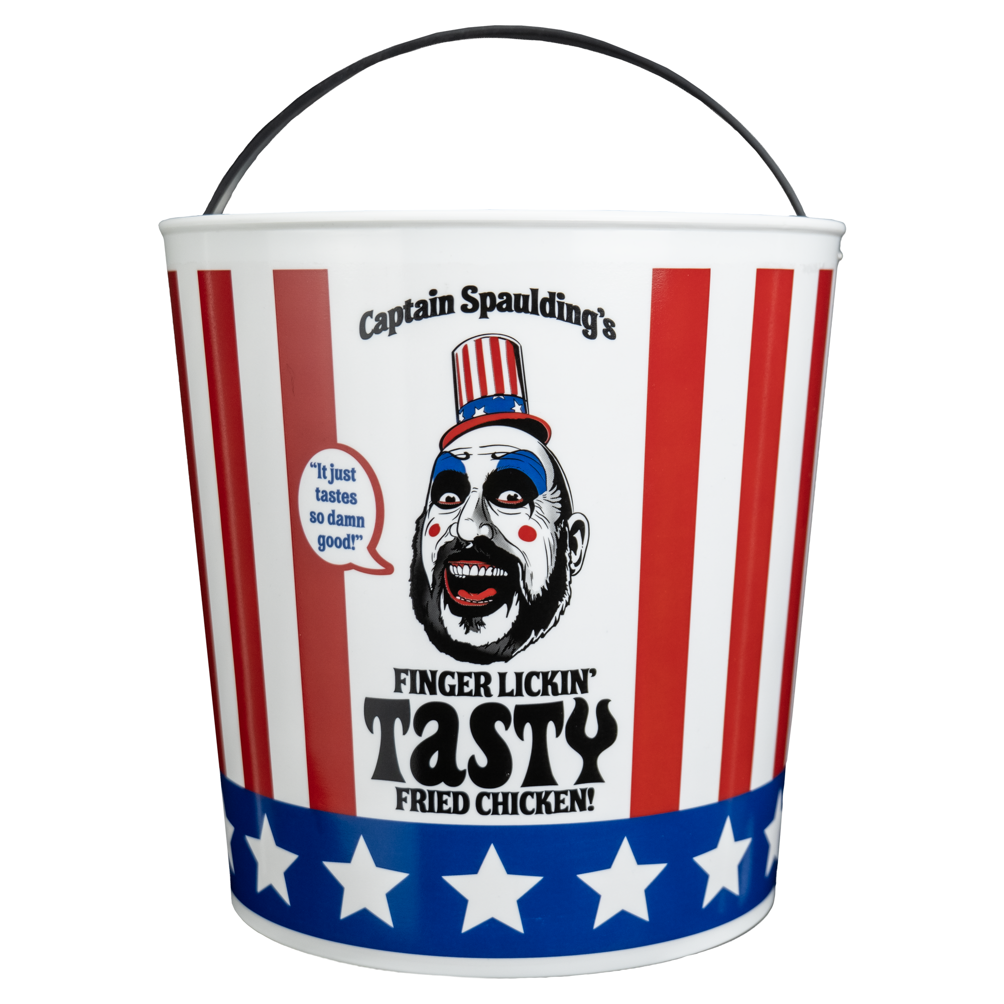 Trick or Treat Studios is proud to present the officially licensed House of 1000 Corpses – Chicken Bucket Candy Pail, inspired by Captain Spaulding’s fried chicken empire and roadside horrorshow. Standing at approximately 8" tall with a sturdy, flexible plastic handle, it’s the perfect companion for a night of trick-or-treating madness.