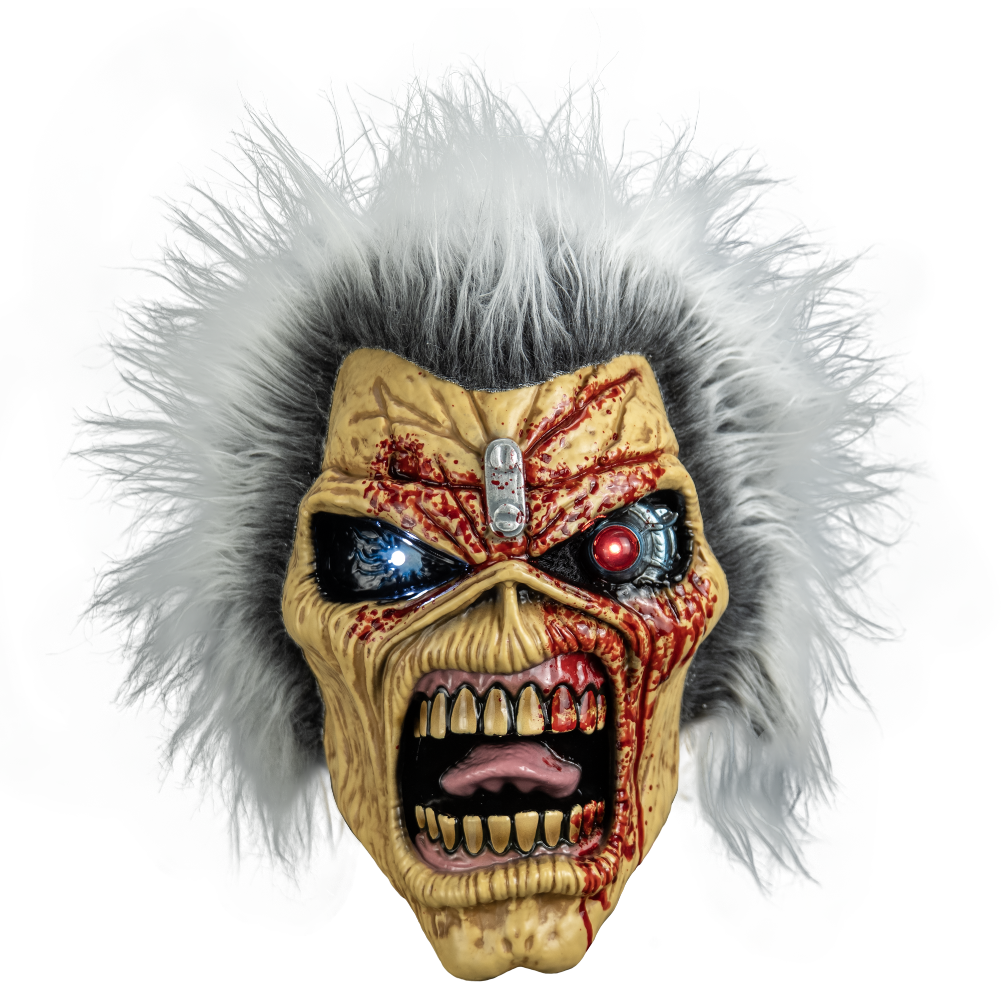 In celebration of 50 years of heavy metal, this new Eddie mask is sculpted after his 50th Anniversary design. This deluxe injection mask features light-up eyes, full coverage 2 tone hair , and a elastic band for comfort.
