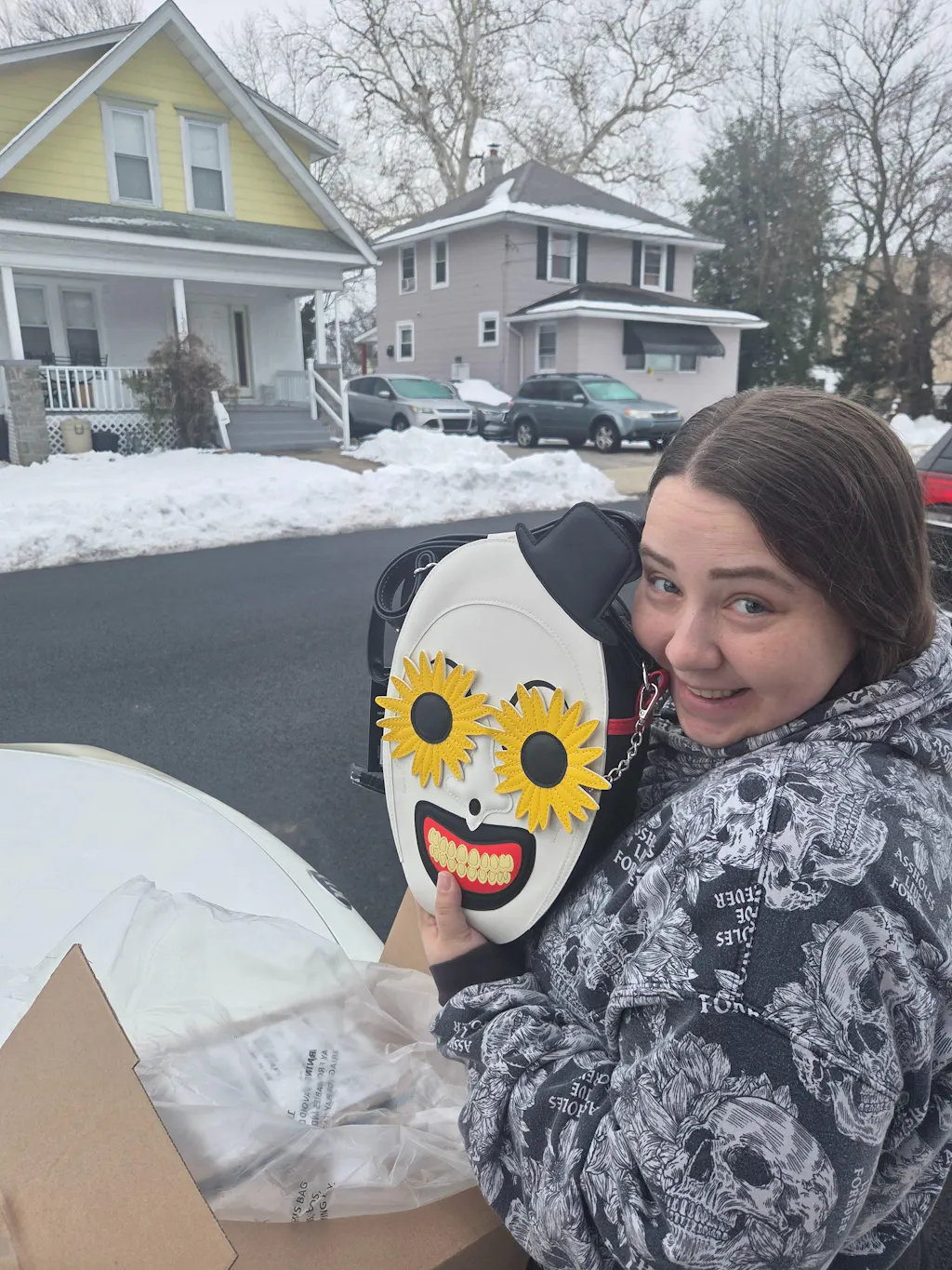 This twistedly stylish purse is made with high-quality Vegan Leather and features the unmistakable mug of Art the Clown—this time with a floral twist. His signature smirk and top hat are made in a layered design, and the bag features removable flower-shaped glasses, which are a magnetic keychain-style attachment, so you can wear the bag with or without his accessory.