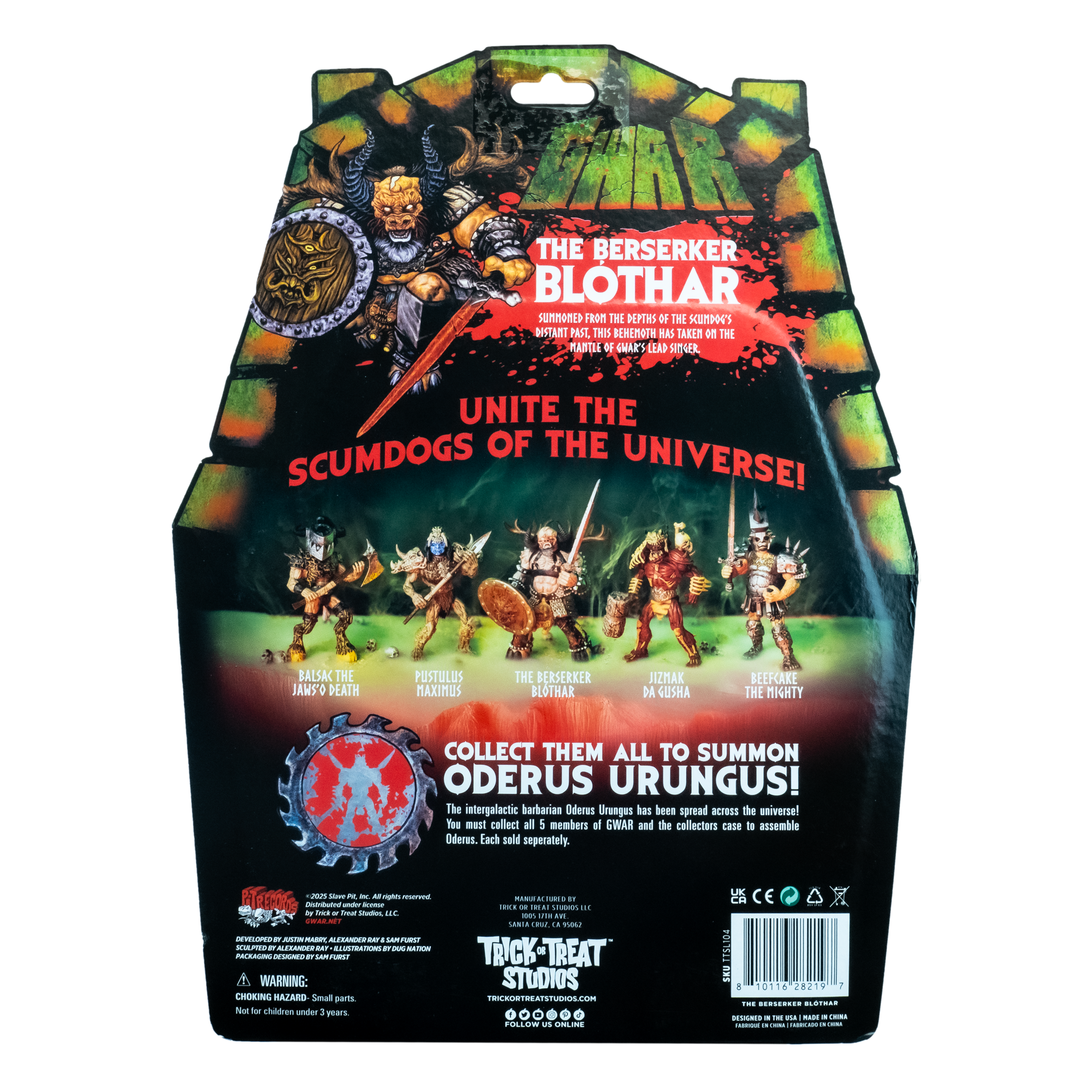 Trick or Treat Studios is proud to present the officially licensed GWAR - Blöthar the Berserker 5" Action Figure. Standing roughly 5 inches tall, this highly detailed figure is a must for any GWAR fan. Packaged in retro style action figure packaging just like your favorite figures from the toy aisle. Backing card features art by Dug Nation.