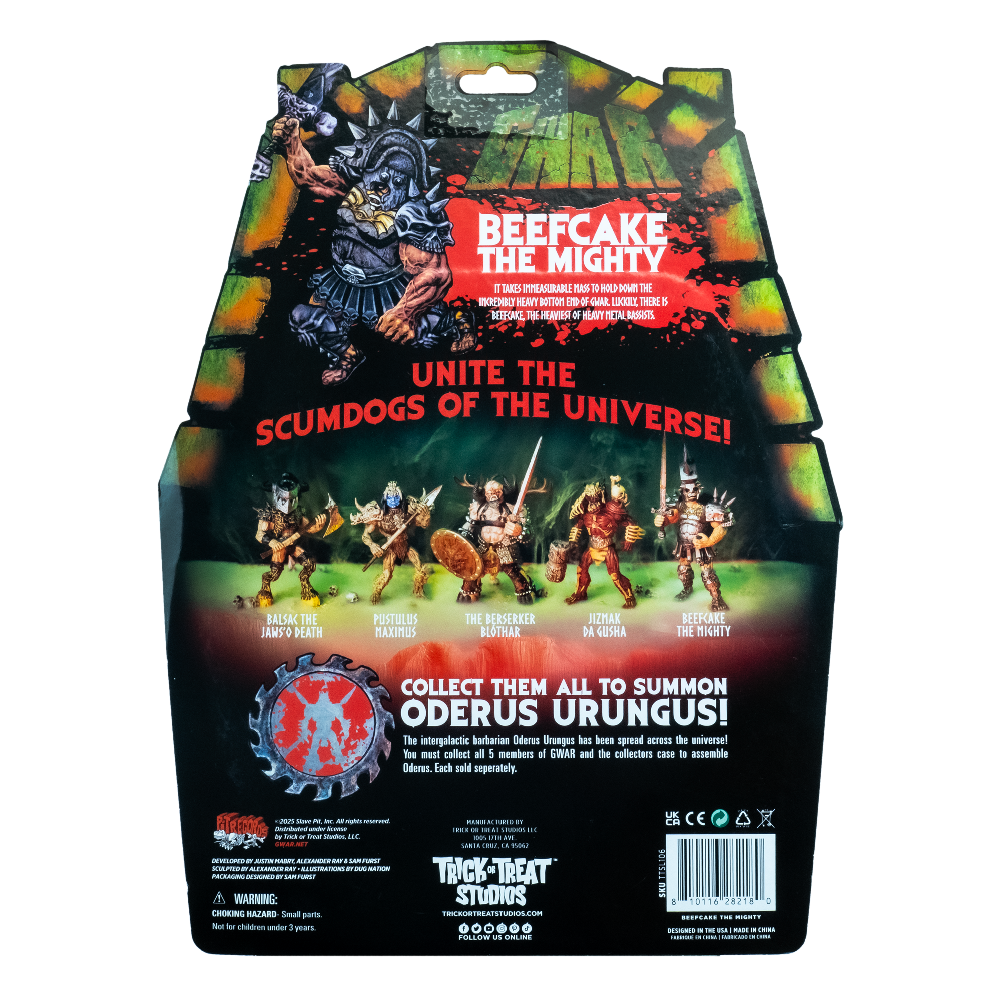 Trick or Treat Studios is proud to present the officially licensed GWAR - Beefcake the Mighty 5" Action Figure. Standing roughly 5 inches tall, this highly detailed figure is a must for any GWAR fan. Packaged in retro style action figure packaging just like your favorite figures from the toy aisle. Backing card features art by Dug Nation.