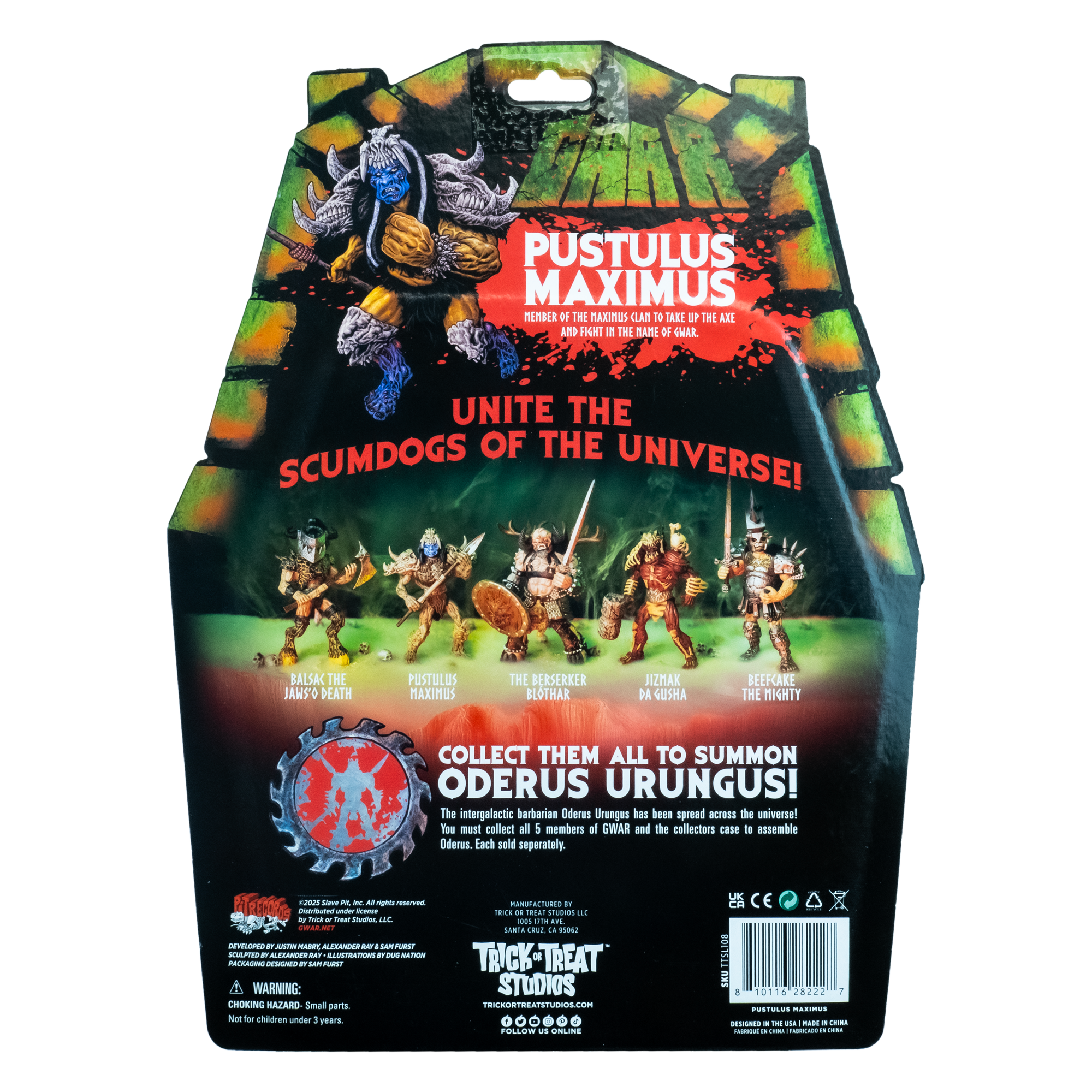 Trick or Treat Studios is proud to present the officially licensed GWAR - Pustulus Maximus 5" Action Figure. Standing roughly 5 inches tall, this highly detailed figure is a must for any GWAR fan. Packaged in retro style action figure packaging just like your favorite figures from the toy aisle. Backing card features art by Dug Nation.