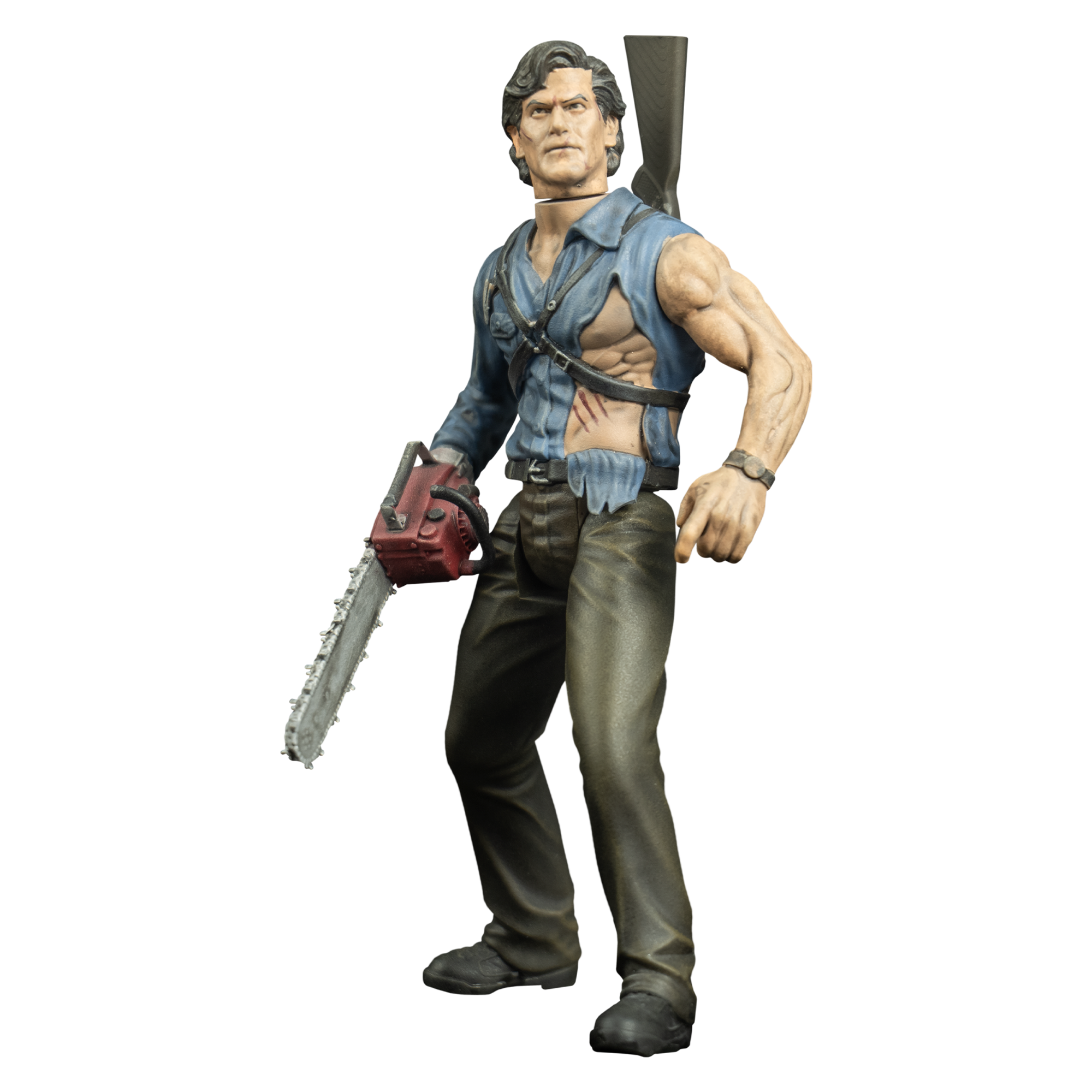 This figure showcases Ash Williams, complete with head swivel, swivel shoulders, hinged hips/legs.