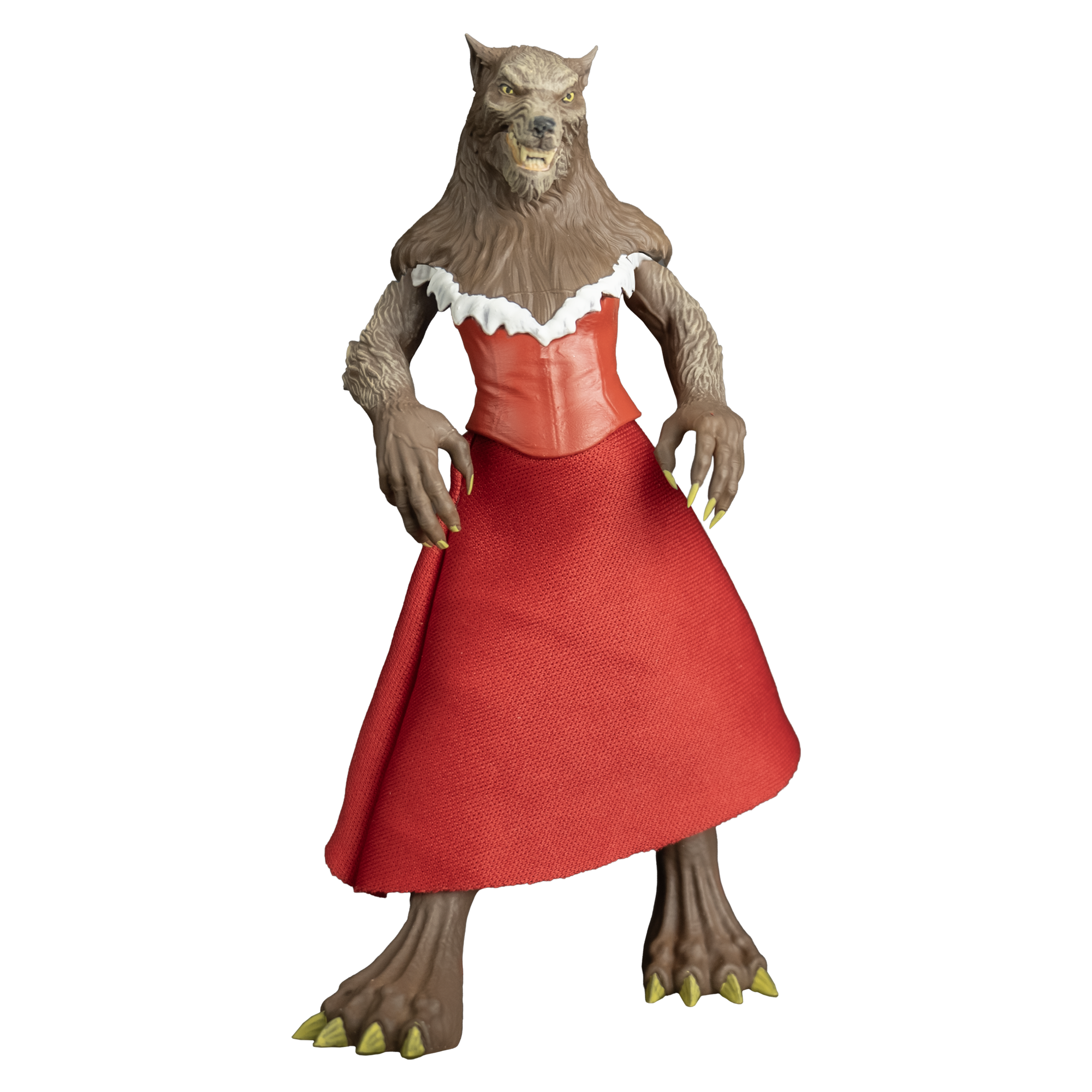 Laurie comes outfitted in a fabric cloak and skirt with plugged-in hair for her signature pigtails. Standing approximately 97mm in human form and 136mm in wolf form, she features swivel articulation at the shoulders, legs, and head for posing and display.