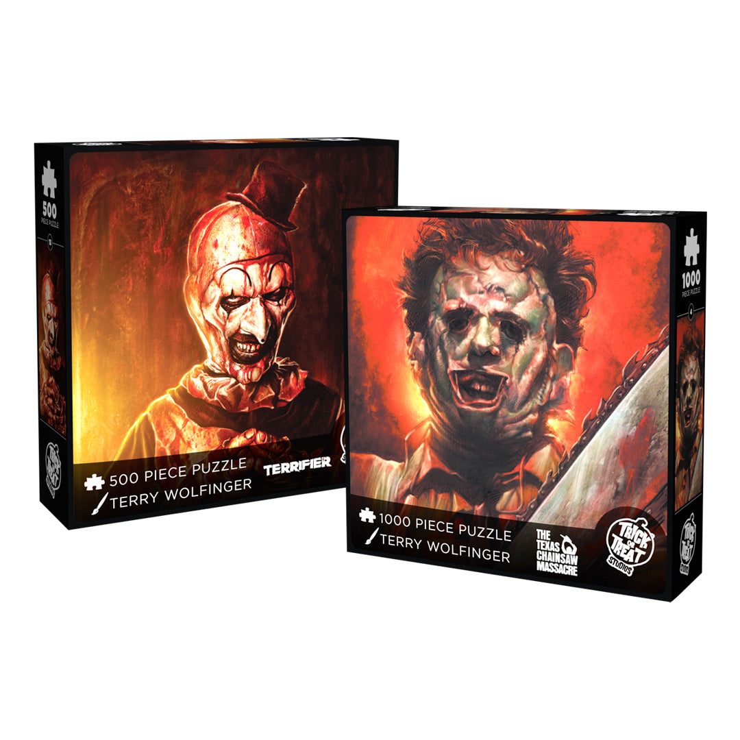 Piece together pure nightmare fuel with this gruesome double-puzzle bundle, featuring the blood-soaked Art the Clown and the iconic Leatherface puzzles.