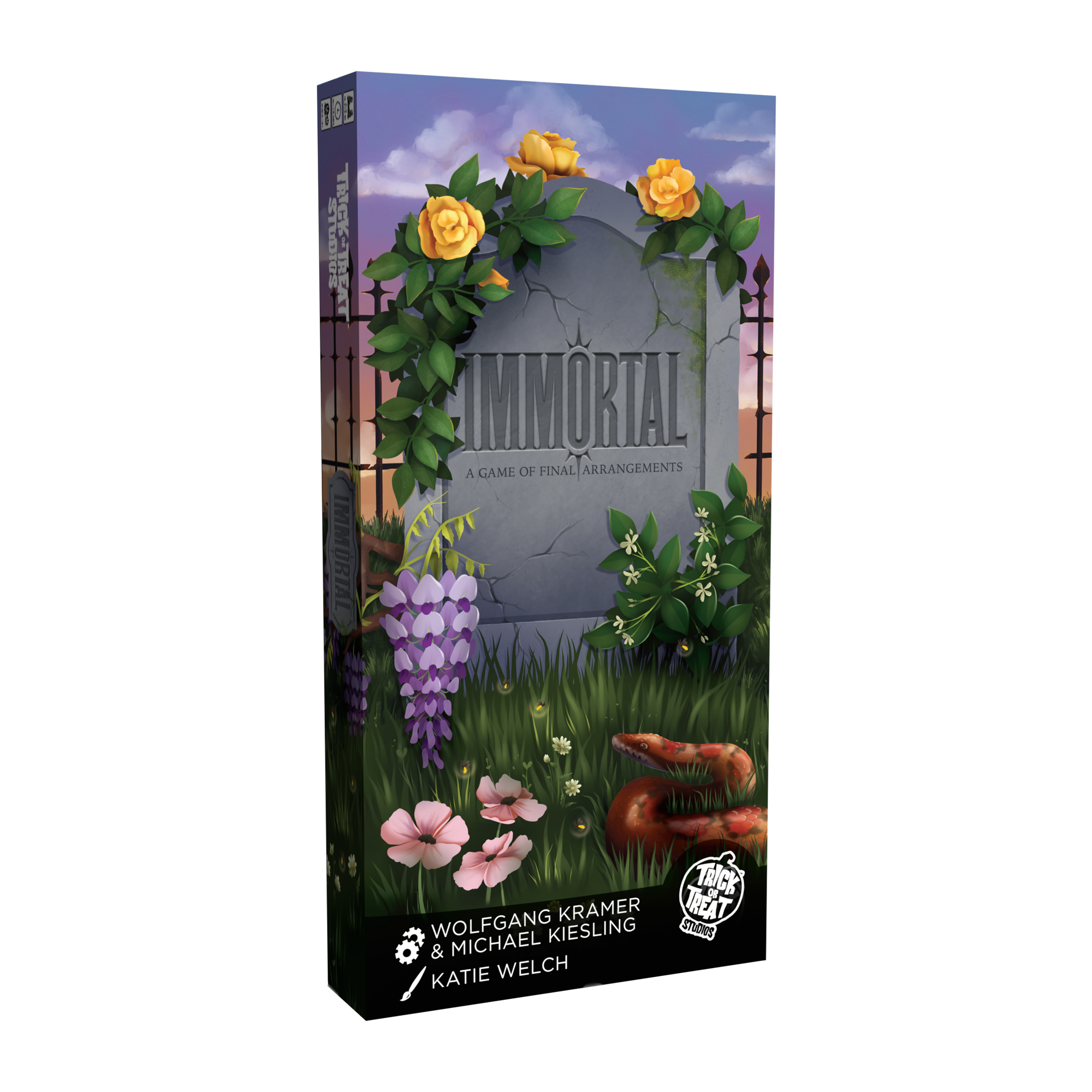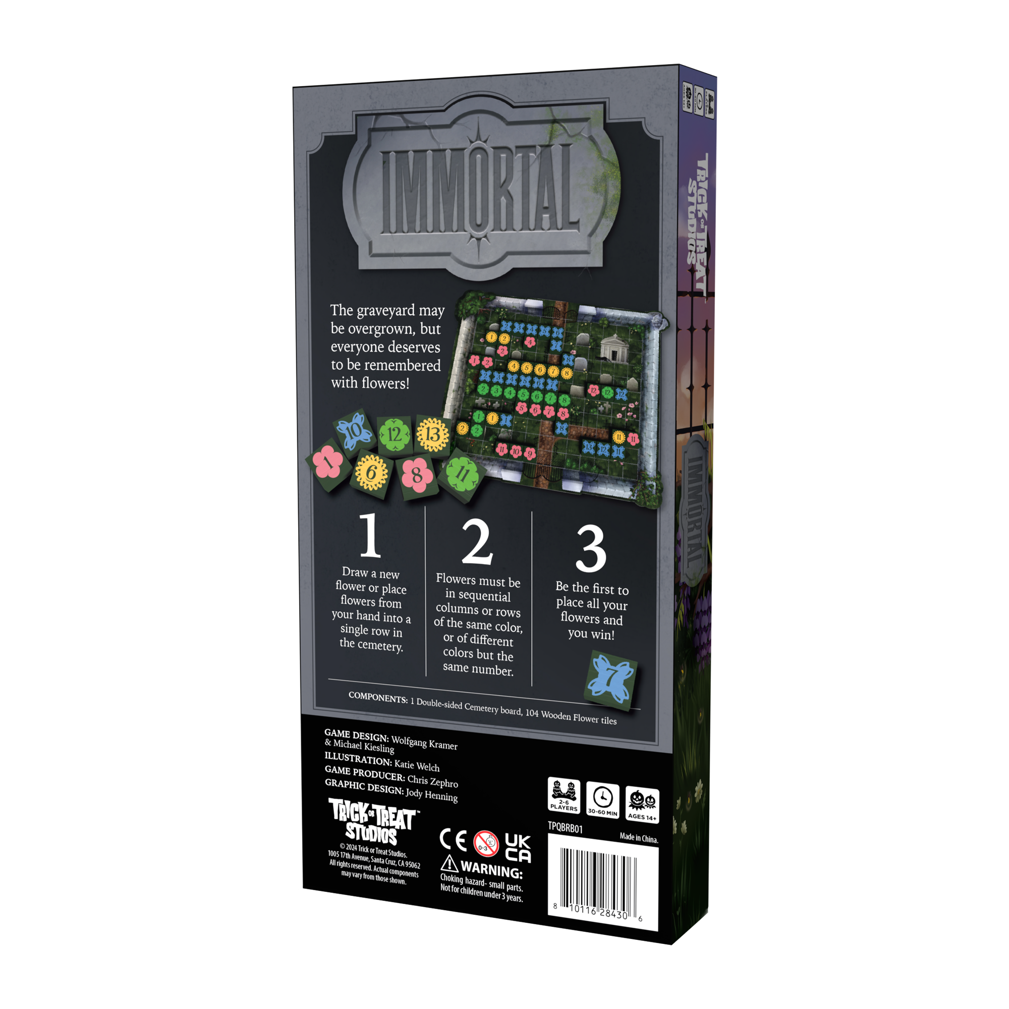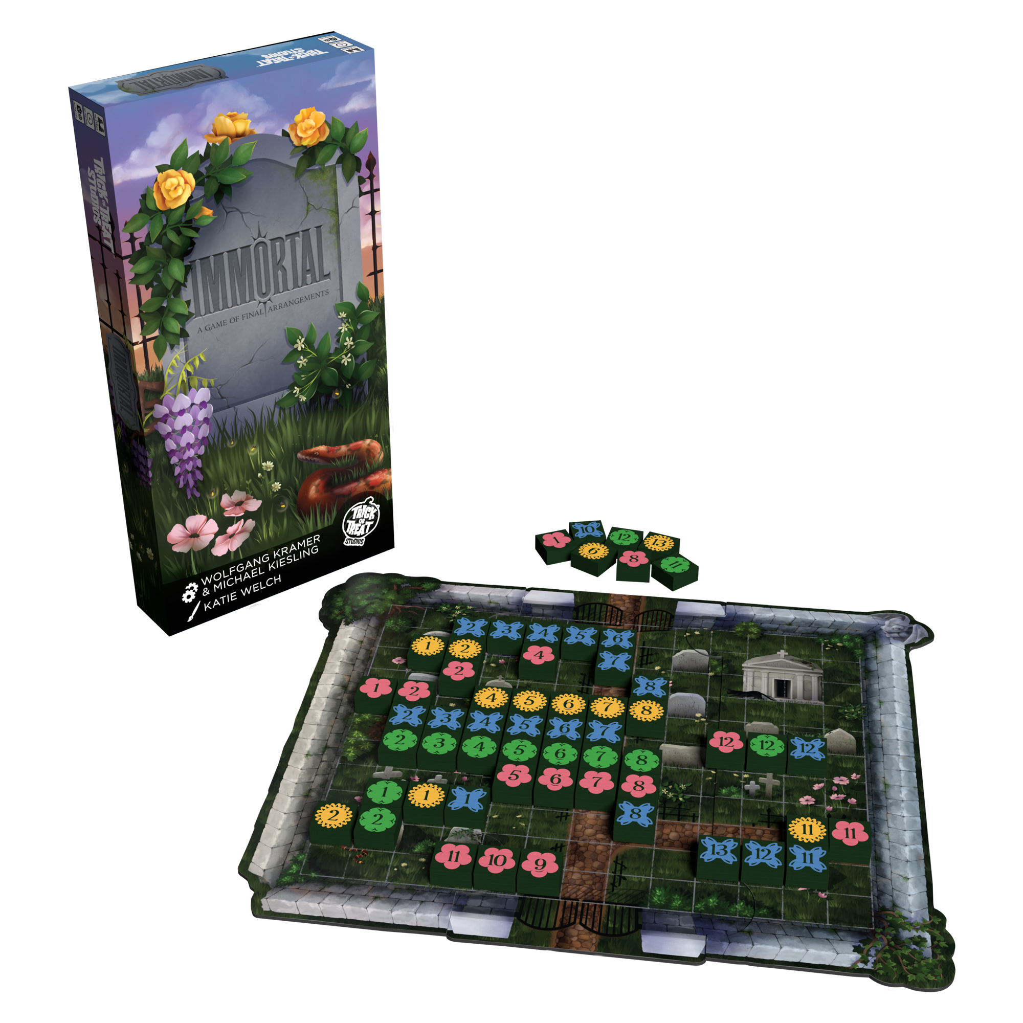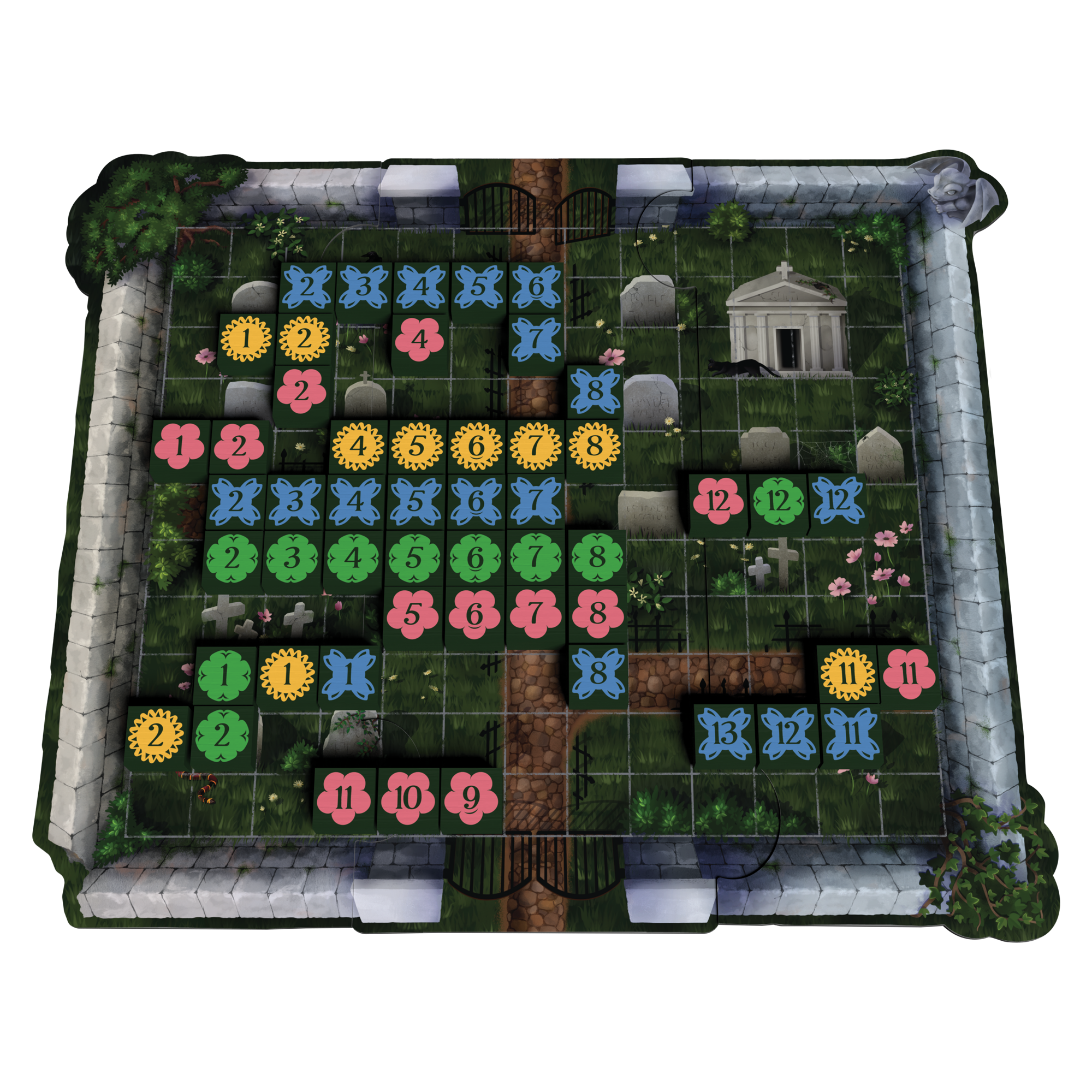 Players will take turns adding Flower tiles to their available flowers or placing them in rows or columns on the Cemetery board. Lines of Flowers must be either sequential numbers or the same number, but different colors. The player who places all their Flowers first is the winner!