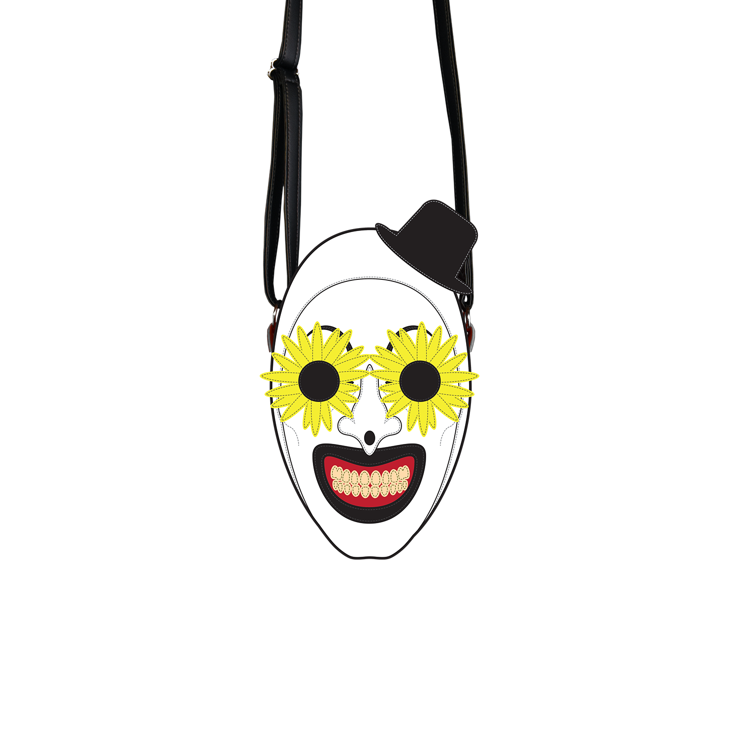 This twistedly stylish purse is made with high-quality Vegan Leather and features the unmistakable mug of Art the Clown—this time with a floral twist. His signature smirk and top hat are made in a layered design, and the bag features removable flower-shaped glasses, which are a magnetic keychain-style attachment, so you can wear the bag with or without his accessory.